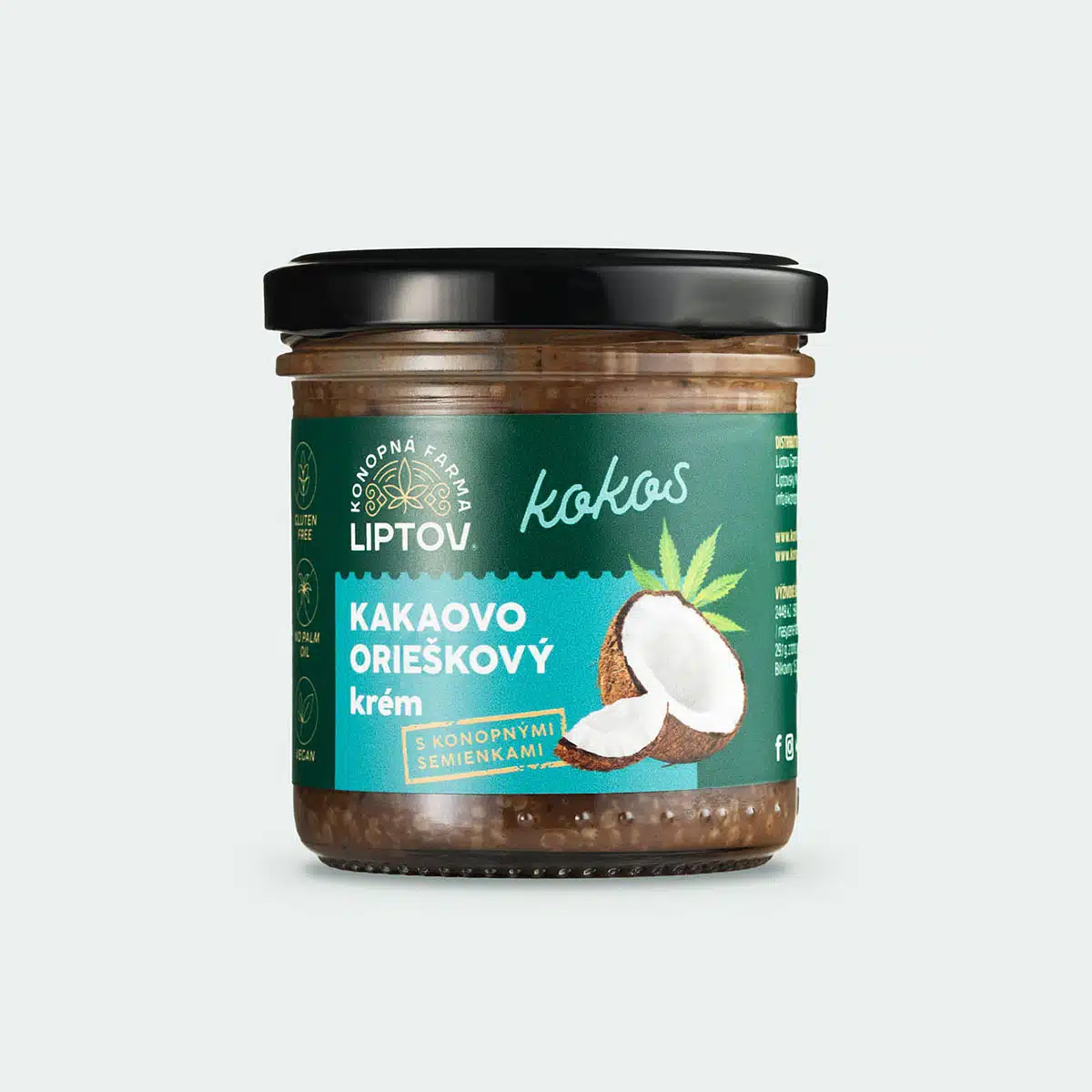 Ingredients: cocoa cream (50%) (sugar, hazelnuts, almonds, cocoa powder, rapeseed oil), hulled hemp seeds (30%), coconut paste (20%)